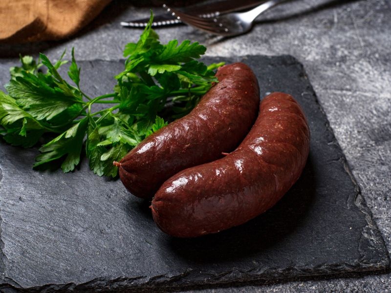 Una volta raffreddato e solidificato, il sanguinaccio di maiale dolce presenta una superficie scura e lucida.